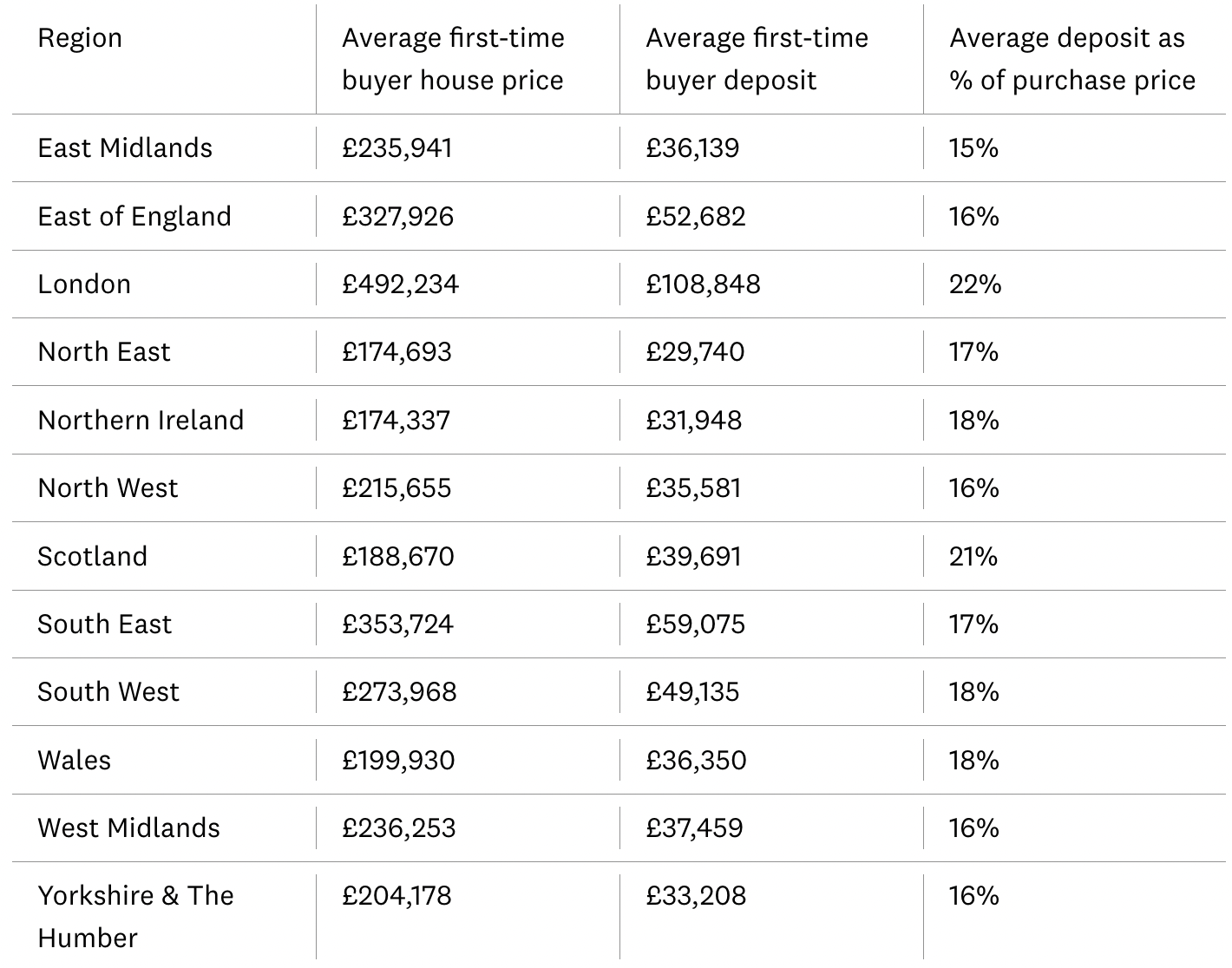 Examine the table below to get an idea on the average first-time house buyer deposit, house price, and purchase across different regions in the UK. These values will help you decide if you are ready to commit in purchasing a new home.