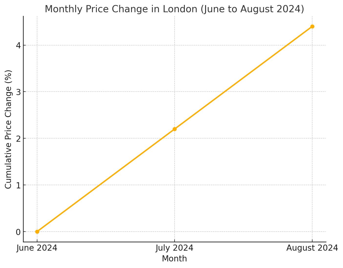 Here is a graph showing the monthly price change in London from June 2024 to August 2024: