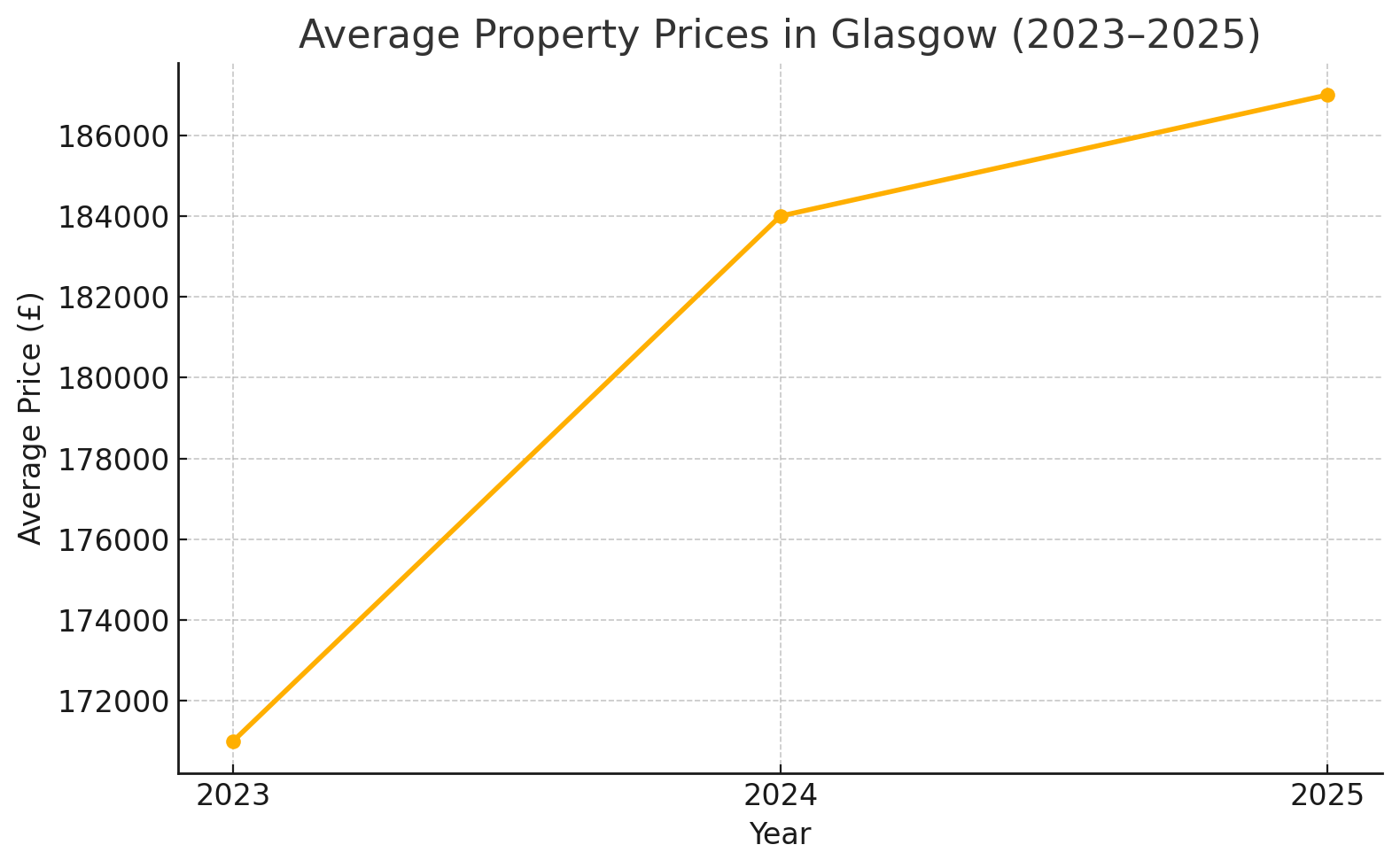 Here’s a line graph showing average house prices in Glasgow from 2023 to 2025 (2025 is an estimate based on current trends):